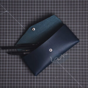 使用鉻鞣羊皮胚內貼豬面皮。羊皮胚是灰白帶點藍的色調,原色能清楚呈現自然紋理,手感細膩、挺度也剛好。這次在製作上需要改進的地方有兩點:彎貼後一起裁切時,邊緣還是容易裁得不平整;另外靠近彎貼與釦子的位置,打斬時比較容易偏移。每次線上課內容都能學到一些新的”眉角”,就持續跟著做+多練習囉