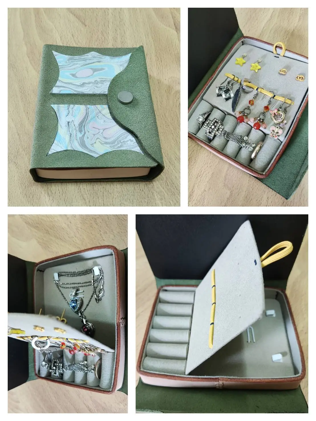 這是一個實驗性的作品,融合許多材料與分類收納設計,像是耳環吊掛、戒指收納、項鍊卡扣等,皆為初次嘗試製作。其中,內部結構較接近盒子,整體尺寸與短夾相近,方便攜帶外出旅行時使用。