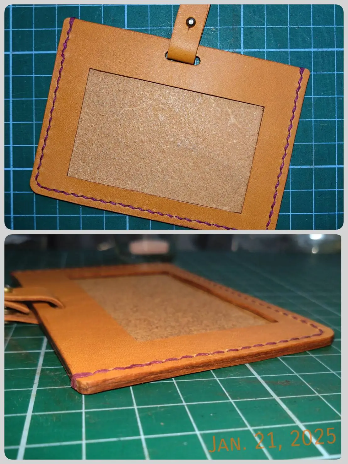 手邊沒有染劑、所以用了之前買的茶色床面處理劑處理邊緣。老師沒有提到都沒有發現平常的邊緣處理比皮革本身顏色淡(也想要試試邊緣深色效果)。
