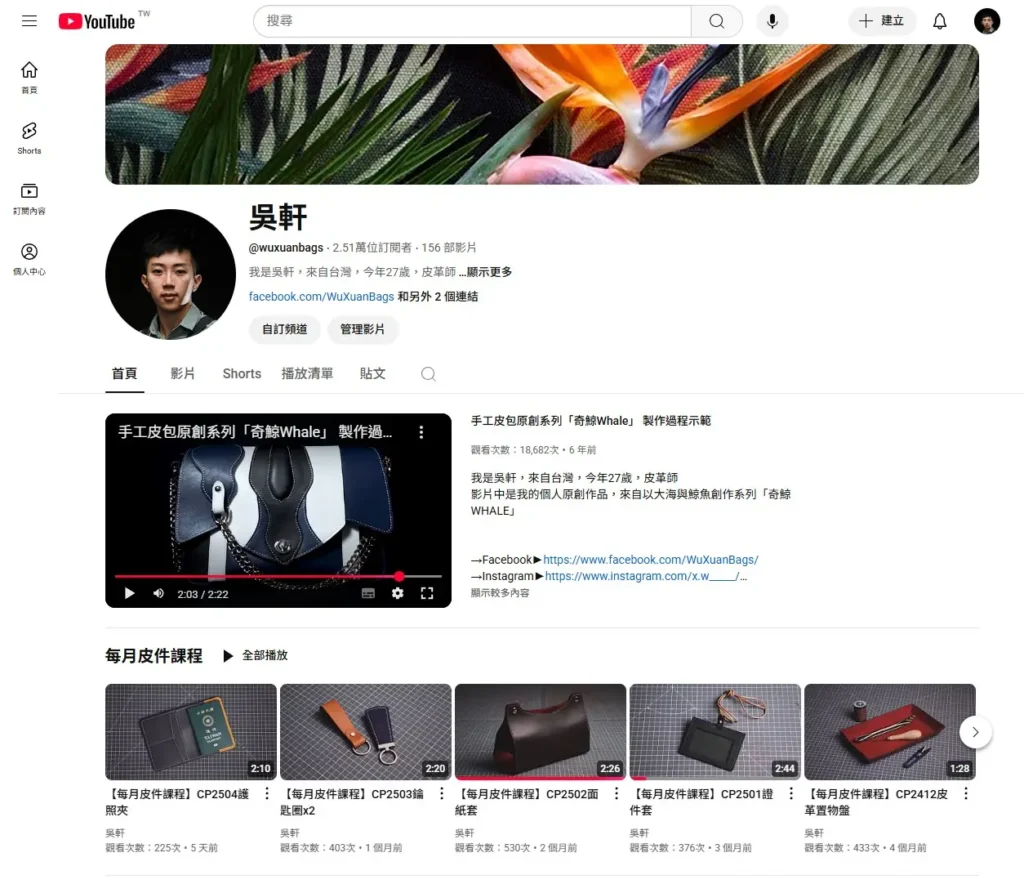 後來隨著越來越多 Youtuber 崛起,我覺得好像可以嘗試看看影片製作,於是我在 2018 退伍後開設了頻道,開始上傳皮革影片,分享了很多作品與皮革知識、還有自己的生活、觀點。