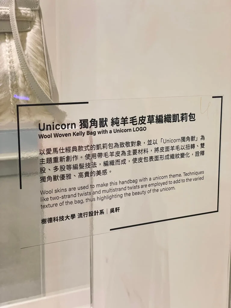 那年我做了一個作品「Unicorn 羊毛編織凱莉包」,是用羊毛皮條進行編織,整體設計是向 Hermès 凱莉包致敬,後來受邀參加高雄科工館的工藝展覽。