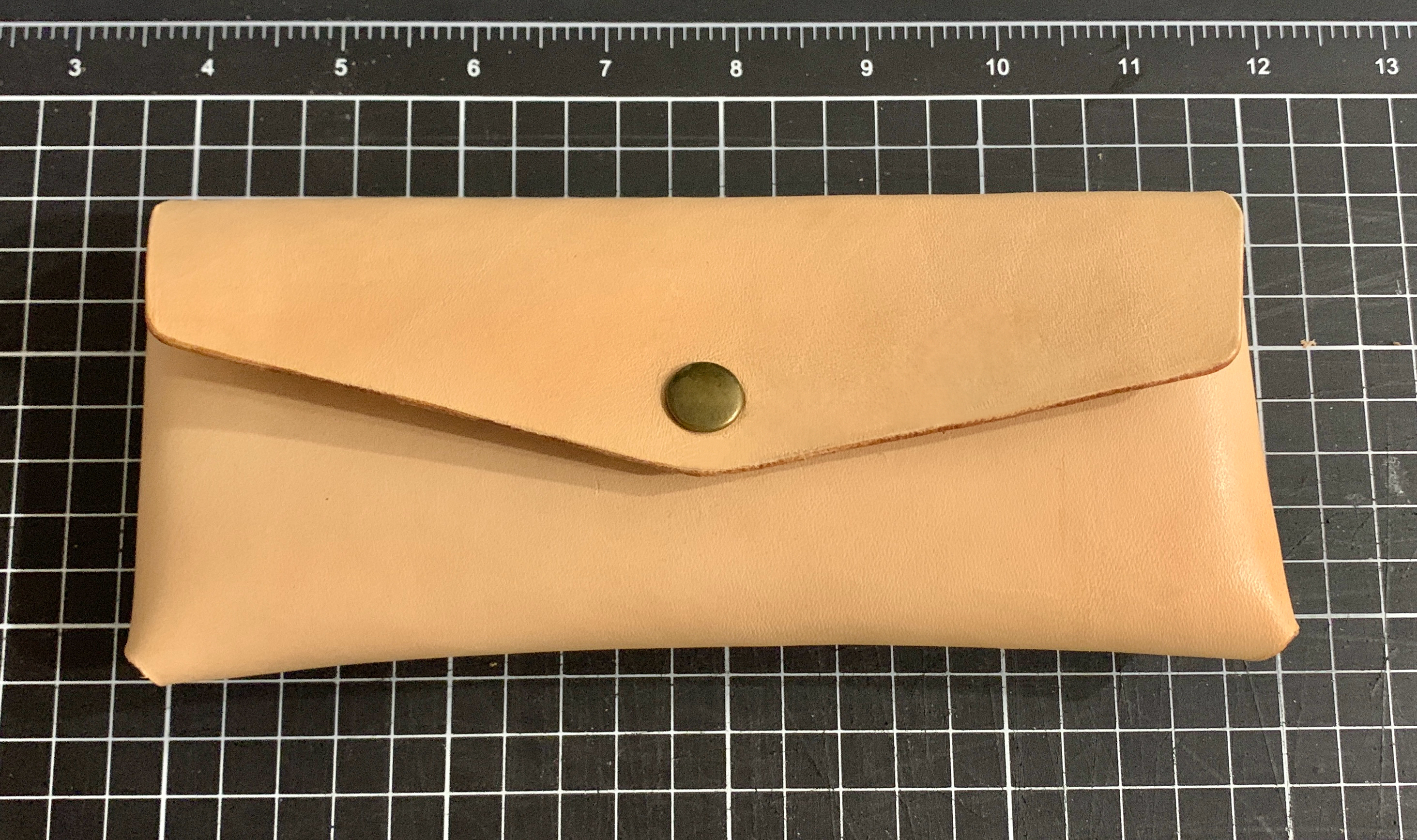 認真看完五個多小時課程,因為家裡材料不足,只能用植鞣牛皮來製作,初次練習植鞣磨邊,邊緣顏色變得更深更立體,也留意了兩片皮對接處要縫合兩圈,完成實用的作品,之後出國就可以帶著它了。