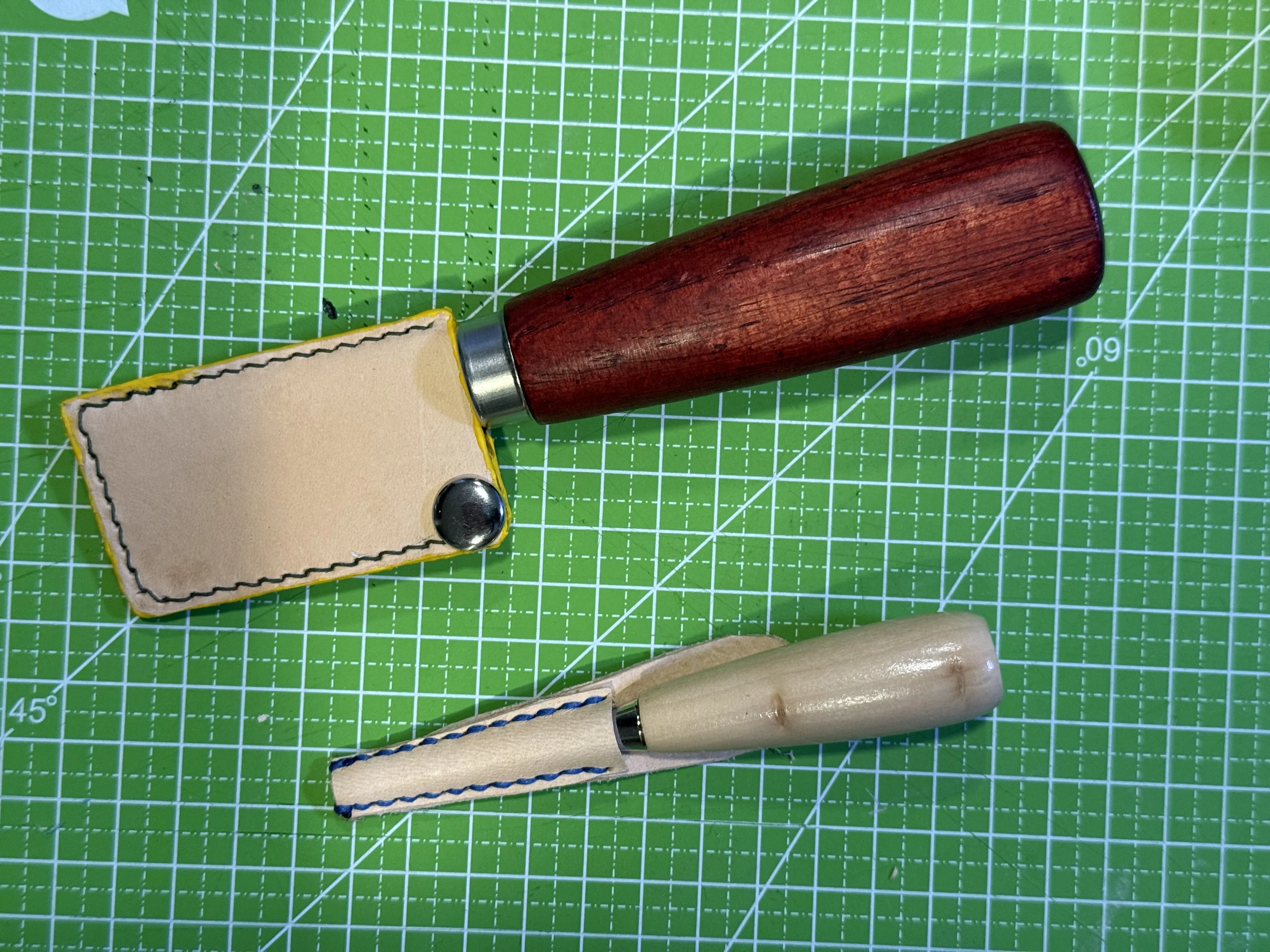 1.因為已經有好幾個作品沒有用過菱斬孔縫線,所以此次在針穿過皮革時,會因為要有斜線感,搓洞時會斜戳,反而拉扯將菱斬洞扯到有點變形而線變成平行,所以雙面波浪沒有都很明顯。