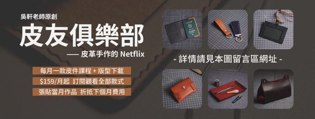 tools package皮革入門工具組 5.0 含贈品訂閱僅限刷卡,無法使用貨到付款 「吳軒精選」皮革入門工具組 5.0 ‧皆經過吳軒老師親身測試、篩選‧不漲價,維持 2023 年價格‧升級為WX邊油、手縫麻線 (下重本啦)‧共 30 個品項,請見商品內說明‧新朋友購買,贈送 資深皮友 1個月(可免費觀看全部皮友課程與版型下載) 購買前請閱讀下方注意事項 請先登入方可購買 登入 登入 Warning: Multiple failed login attempts will get you locked out temporarily. 使用者名稱 或 電子郵件 *必填 密碼 *必填 保持登入 登入 忘記密碼? 忘記密碼?請點我重置 免費註冊 2023-一般-註冊表單中文全名台灣手機電子郵件成為會員 並 繼續下一步 預購 & 贈品 注意事項 本產品設計給「皮友俱樂部每月課程」的皮友方便,包含絕大多數的所需工具 非皮友者購買,贈送 資深皮友 1 個月 ,購買成功後將自動開通,記得來看課程呀! 您可以在 資深皮友 1 個月 期間觀看所有皮友課程、下載皮友限定免費版型 自第二個月後,系統將以 $199/月 續訂扣款,如果不打算續訂,請務必記得取消喔! 皮友俱樂部簡介如下圖,詳情請 [點我了解]
