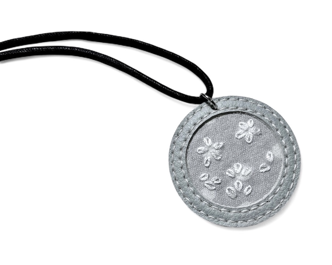 我使用白色繡線將日常生活中可見的花朵元素,用刺繡的技法在淺灰色的棉布上作畫再與淺灰色的皮革結合,設計成同色系小清新風格的皮革項鍊/吊飾/鑰匙圈。